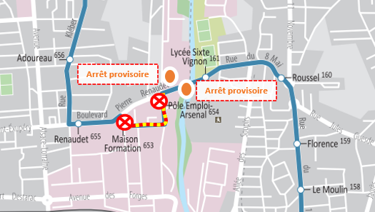 En raison des travaux avenue des tilleuls, les arrêts Maison formation et Pôle Emploi-Arsenal ne seront pas desservis